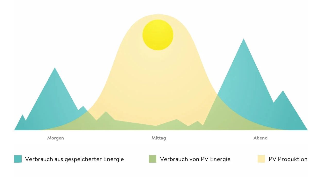 Die Photovoltaikanlage produziert mehr Strom, als verbraucht wird. Die überschüssige Energie wird gespeichert und steht Ihnen später zur Verfügung.